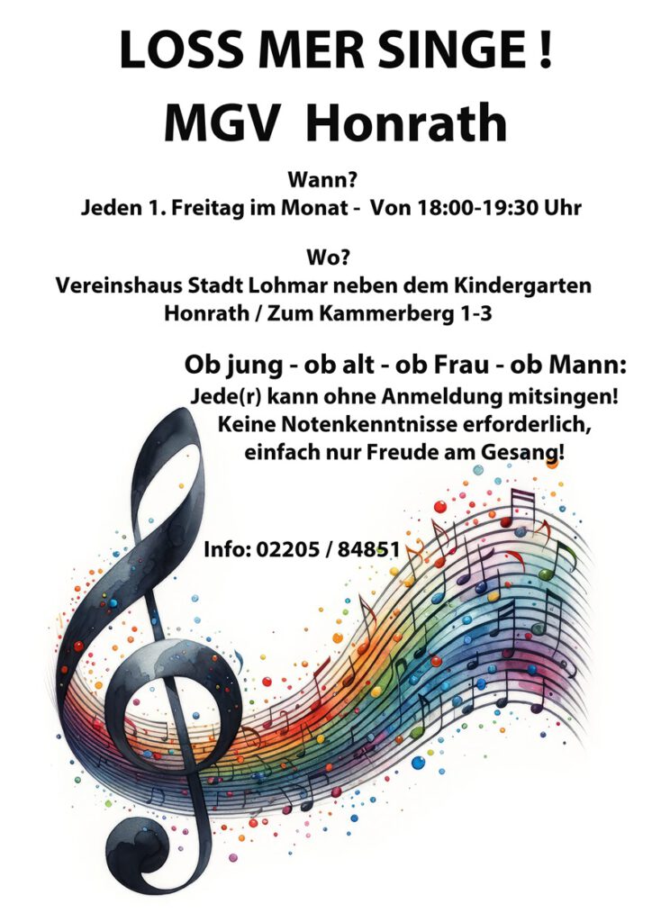 Bringen Sie ruhig Freunde und Bekannte mit. Weitere Informationen gibt es unter www.mgv-honrath.eu oder unter 02205 / 84851.